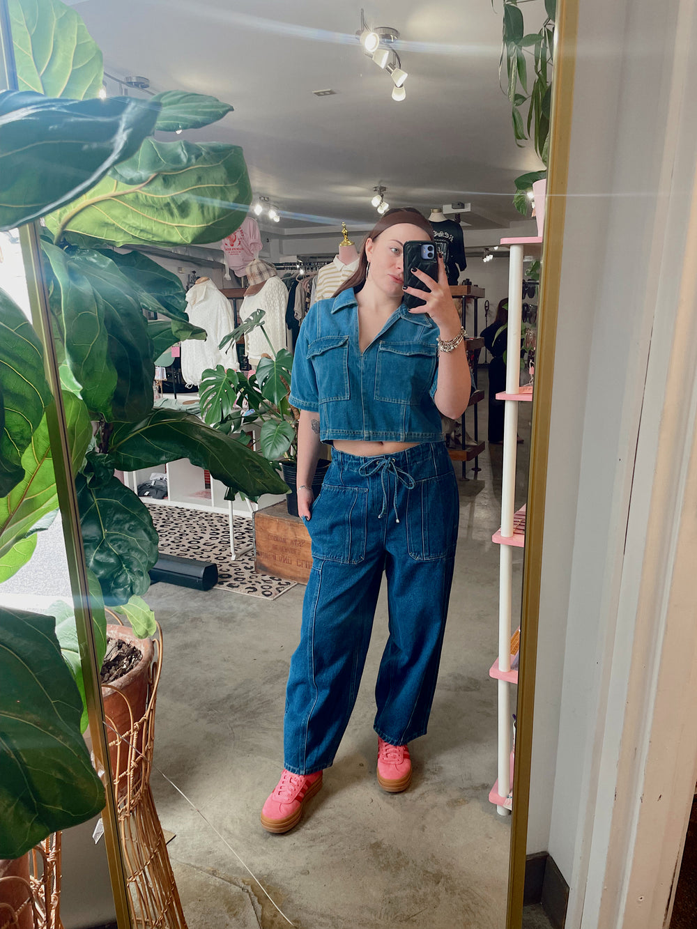 This cropped denim top brings a fresh twist to a classic staple. Designed with a flattering V-neckline and short sleeves, it features front patch pockets and an enzyme garment wash for a soft, lived-in feel. The structured yet easy fit makes it perfect for pairing with white high-waisted shorts for a crisp, stylish contrast or layering into your everyday denim rotation.