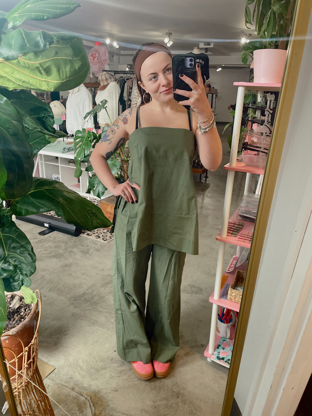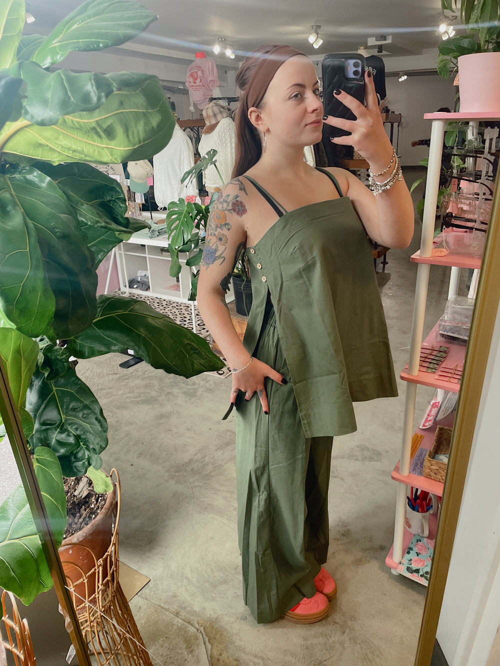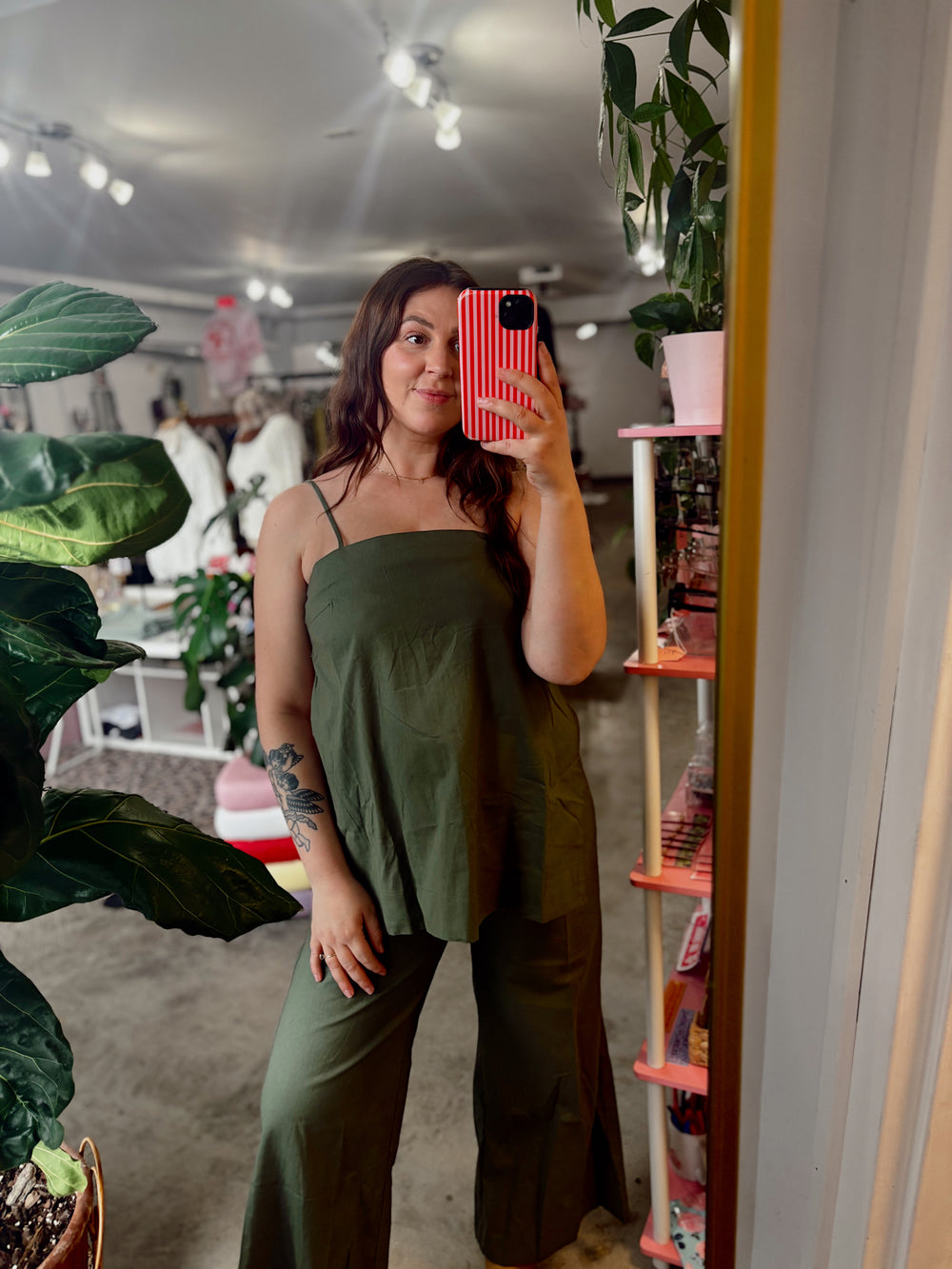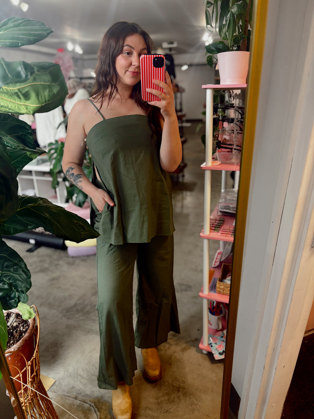 This breezy two-piece set is made for comfort without sacrificing style. The spaghetti strap top features a relaxed fit, side slits for easy movement, and modern side button details for an elevated touch. The matching wide-leg pants include an elastic waistband and pockets (because we love functional details), creating an effortlessly put-together look.
